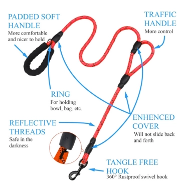 Both handles feature soft padding to provide a secure and comfortable grip, preventing rope burns or hand strain when your dog pulls. With its durable metal clip and tangle-free design, this leash ensures a smooth walking experience for both you and your furry friend. Whether for training sessions, daily exercise, or safe walks in busy environments, this double-handle leash offers strength, comfort, and peace of mind.